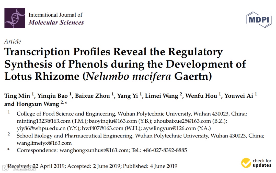 武汉轻工大学王宏勋教授团队在《Molecular Sciences》杂志上发表了“Transcription Profiles Reveal the Regulatory Synthesis of Phenols during the Development of Lotus Rhizome (Nelumbo nucifera Gaertn)”一文,该研究采用高通量测序技术,以荷花根茎部分为研究对象,探讨酚类物质在不同生长发育阶段(S1、S2、S3、S4、S5、S6)的积累情况,分析了荷花生长发育过程中参与酚合成代谢途径的特定基因,初步阐明了荷花酚类化合物的生物合成机制,为了解荷花酚类化合物在采后贮藏和加工中的功能活性的发展提供理论依据。百易汇能生物在本次研究中担任了测序分析工作。