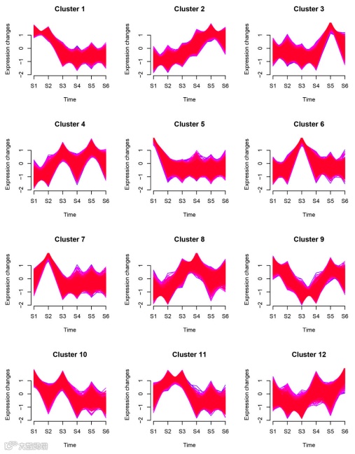 时间序列分析显示共聚为12个Cluster,其中Cluster 1显示在根茎发育过程中有2856个基因表达下调;Cluster 2显示在发育阶段有2108个基因表达上调;Cluster 3在S5中显著表达。Cluster 8中的基因在S3和S4中高表达,而Cluster 9在S3和S4中低表达(图2)。