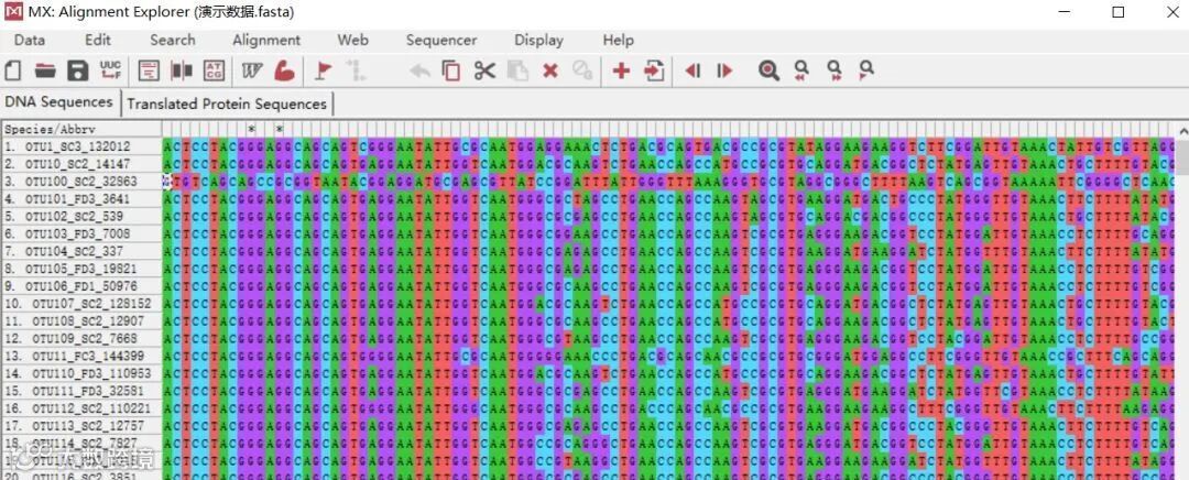 Muscle的功能仅限于多序列比对,它的最大优势是速度,比ClustalW的速度快几个数量级,而且序列数越多速度的差别越大。方法可以通过点击图中上方Alignment或者下方的图标「W」和「Muscle」来选择。如果你的序列是DNA编码序列,就一定要选择Align Codons,因为序列通过密码子比对比DNA序列的比对会更加真实,避免间隙对比对结果产生的影响。MEGA可以比较方便快速地将密码子排列比对,后续作为输入文件在软件PAML或DATAMONKEY中进行进化压力的分析时就会比较方便。