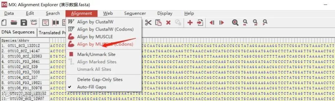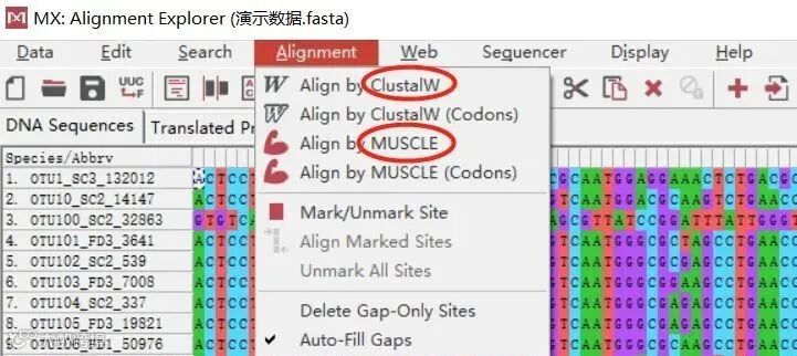 MEGA中有两种序列比对方法:Muscle和ClustalW。