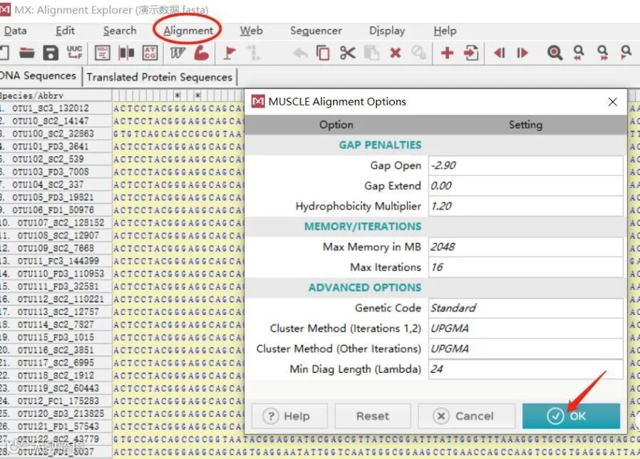 在这里我们选择Muscle进行序列排列,点击Align DNA,会出现一些参数选项,根据自己需要进行修改,在这里直接点击OK选择默认参数即可。