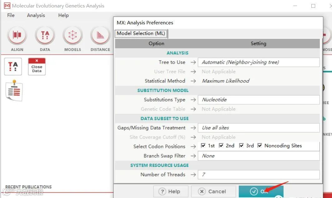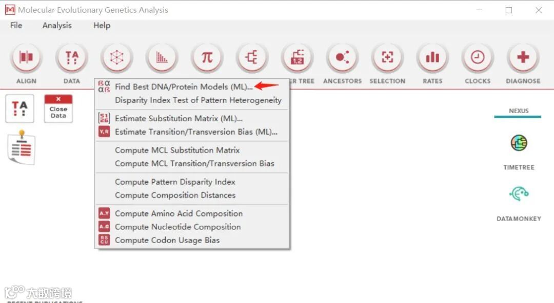 分析后返回主页面,接下来我们要选择一个最优的模型,提高建树的精确度。如果想要快速建树可以省去这一步,直接选择默认的模型。点击MODELS中的Find Best DNA/Protein Models(ML) 软件就会根据你的数据帮你计算寻找最适合的模型。