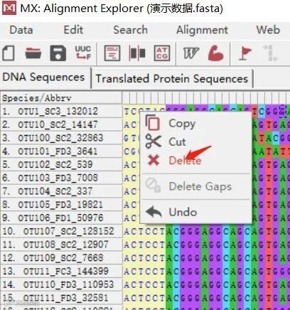 对齐过程需要一段时间,对齐完成后,最好将序列两端切齐,选择两端不齐的部分,单击右键,选择 delete 即可。