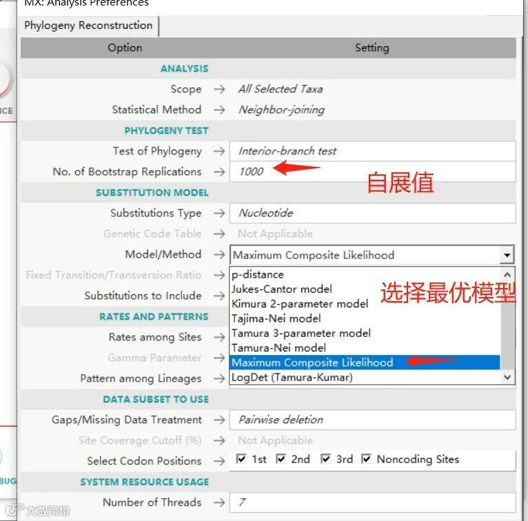 点击方法后,选择自展值,即重复建树以进行检验的次数,一般选择1000以上才比较可靠。模型选择之前计算好的最优的模型,点击OK。