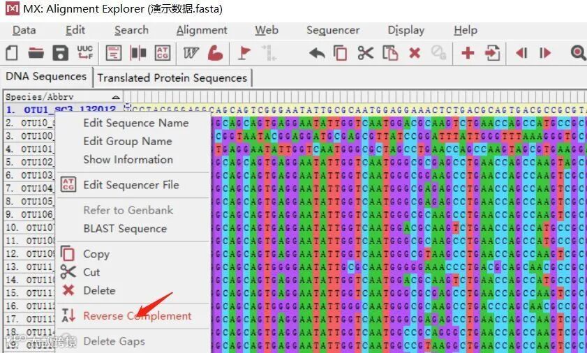有的差异很大的或许是因为序列方向反了,这个时候要把它反转回来,右击这条序列,点击Reverse Complement,反转后一定要再次点击Muscle比对,检查是否大部分都对齐了。