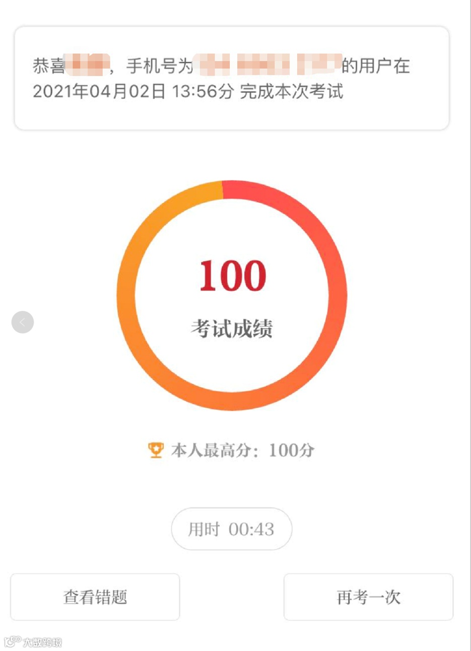 考试完成,可查看本次考试成绩和错题解析
