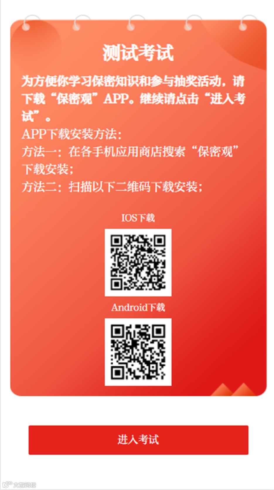用手机浏览器扫描下列二维码下载“保密观”APP,注册成为会员;已下载安装的如看不到考试页面,请更新APP至最新版本