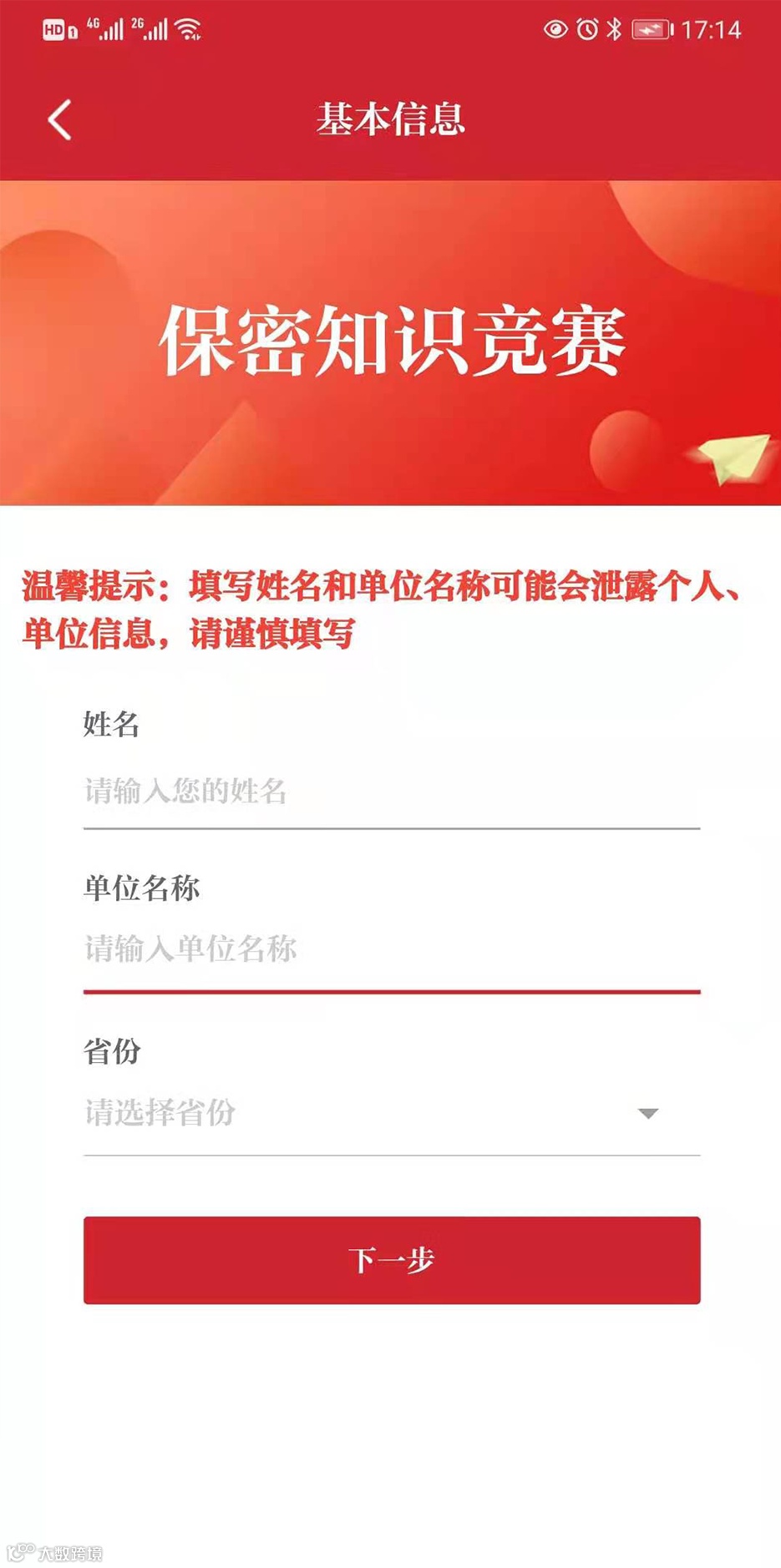 进入考试界面,填写“姓名”“单位名称”,选择“省份”,点击“下一步”开始考试