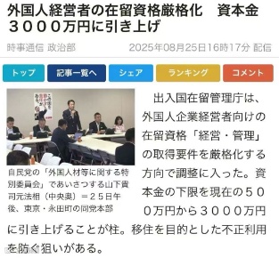 对此日本多位国会议员公开质询:“为何日本的创业签证门槛远低于美国、新加坡、韩国等国?”。日本保守党众议员竹上裕子也指出:“是否应以美国金额为参考,将经营管理签证标准提升至更合适的水平?”