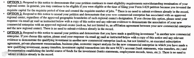 ⚠️需要注意的是,移民局规定,投资人在收到该通知书183天以内 (如果居住在美国境外,则194天内) 采取以下三个选项之一回复移民局,否则移民局会默认投资人选择了选项1来推进申请。