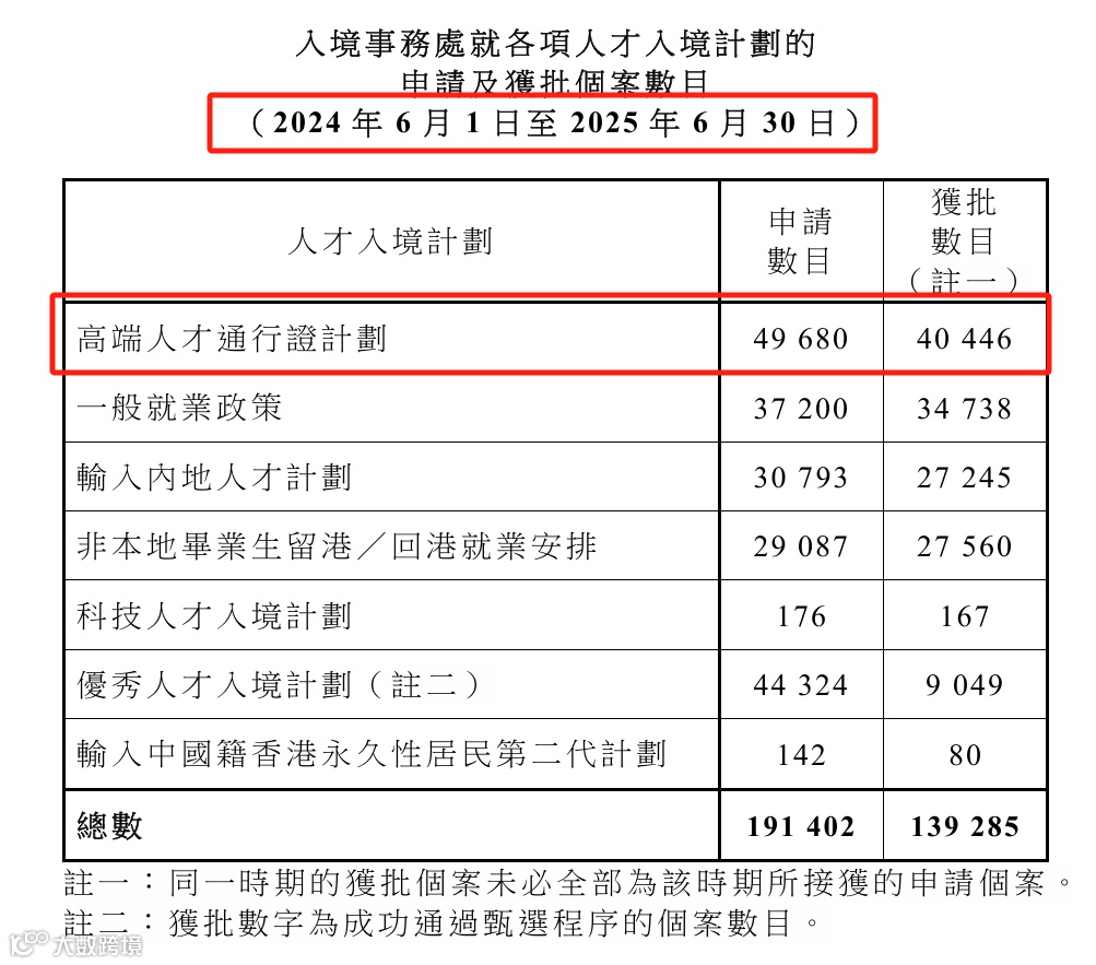 近1年时间内,香港各类人才入境计划共批出13.9万宗申请。其中申请人数和获批人数最多都是高才通计划,其中申请数量是49680宗,获批数量是40446宗,获批率达81.41%。