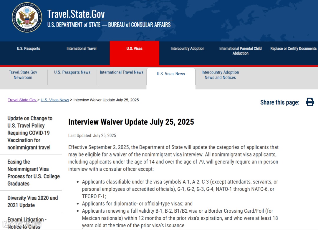 9月2日起,美国签证免面谈续签政策大幅收紧