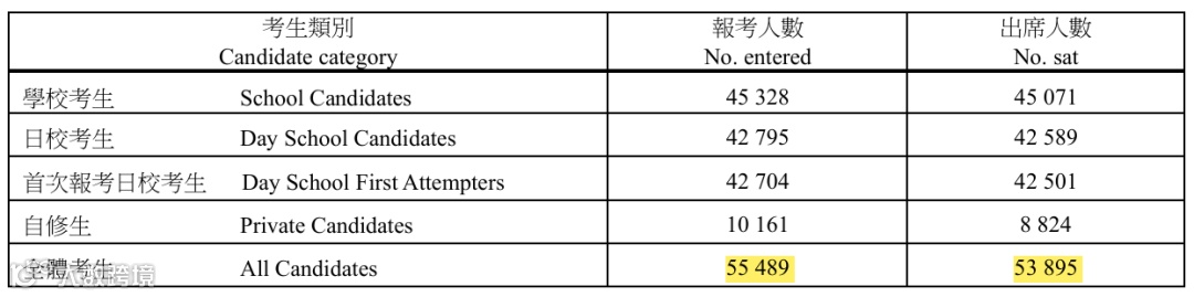 今年考生共55489人,实际出席约53895人,其中日校(全日制)考生42589人,自修生8824人。