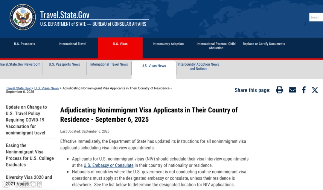 当地时间2025年9月6日,美国国务院发布通知,即日起所有非移民签证申请人必须在国籍国或合法长期居住国的美国使领馆面谈申请,“第三国面签”渠道全面取消。