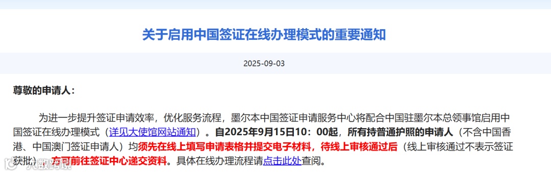 另外,自2025年9月15日起,堪培拉中国签证申请服务中心、珀斯中国签证申请服务中心、布里斯班中国签证申请服务中心将停止受理签证申请。