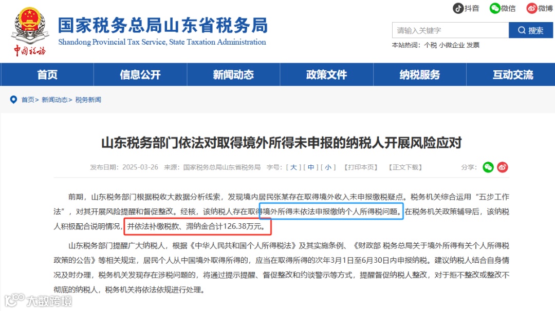 2025年3月25日和26日,湖北、山东、浙江和上海四地税务机关几乎同步发布新闻稿,透露它们根据税收大数据分析线索,对未申报境外收入的纳税人开展风险提醒和督促整改,分别补缴税款与滞纳金141.3万元、126.38万元、18.48万元和12.72万元,合计近300万元。