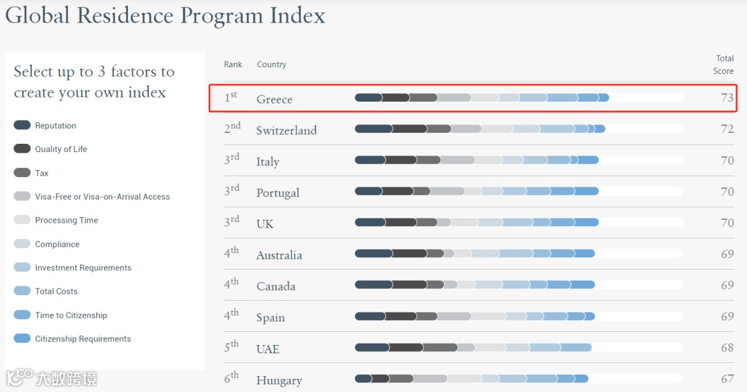 根据全球财富咨询公司Henley & Partners最新发布的《2025年全球居留计划指数》,希腊黄金签证计划以73分(满分100分)首次位居榜首,并终结了葡萄牙连续九年的领先地位。该指数对全球26个投资居留计划进行了评估,排名前十的国家和地区如下: