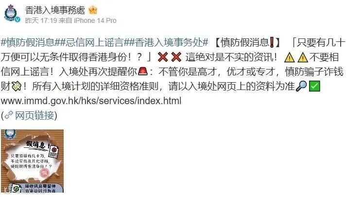 翻遍了香港特区政府的所有官方网站,发现根本不存在什么“特别通道”项目,更别提一步到位直接申请香港永居的捷径了!香港入境事务处甚至还专门在社交平台上发帖打假,明确指出这种说法纯属子虚乌有。