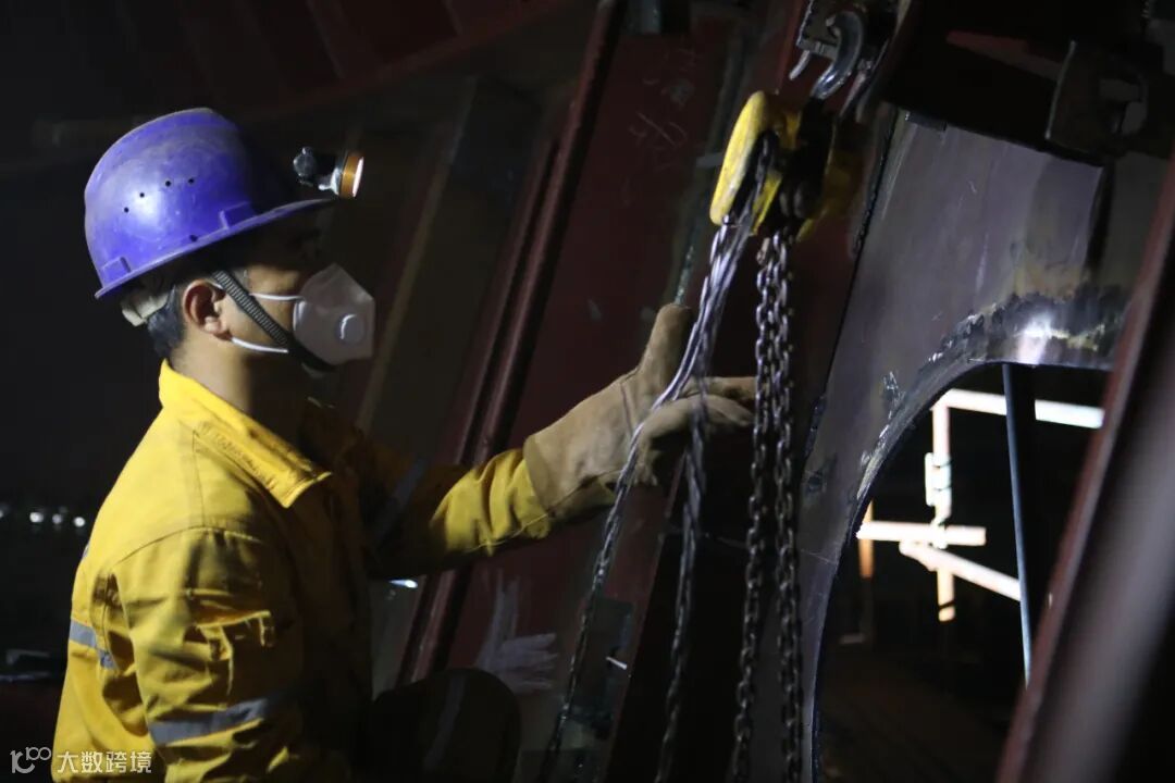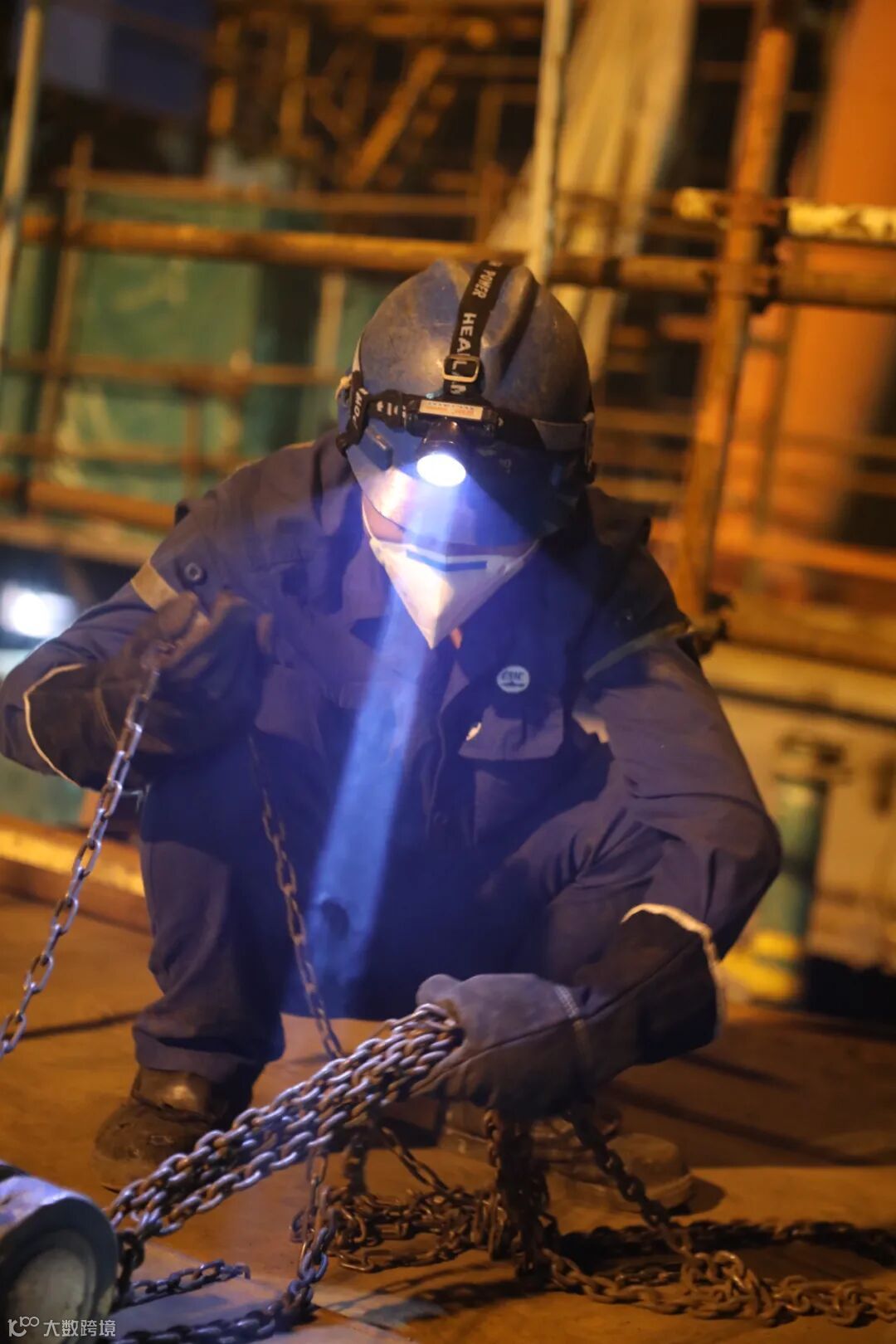▲20:00,在4000hp拖船上,刚刚完成导缆孔开孔,工人师傅没有一丝停歇,继续熟悉地拉着手拉葫芦,紧锣密鼓地准备安装导缆孔。