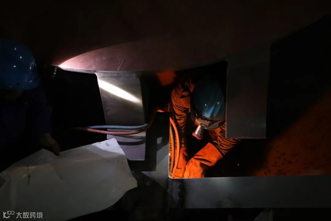 ▲21:22,在2000吨北保上,工人师傅挤在舵桨基座下方,认真地清理焊接余量。