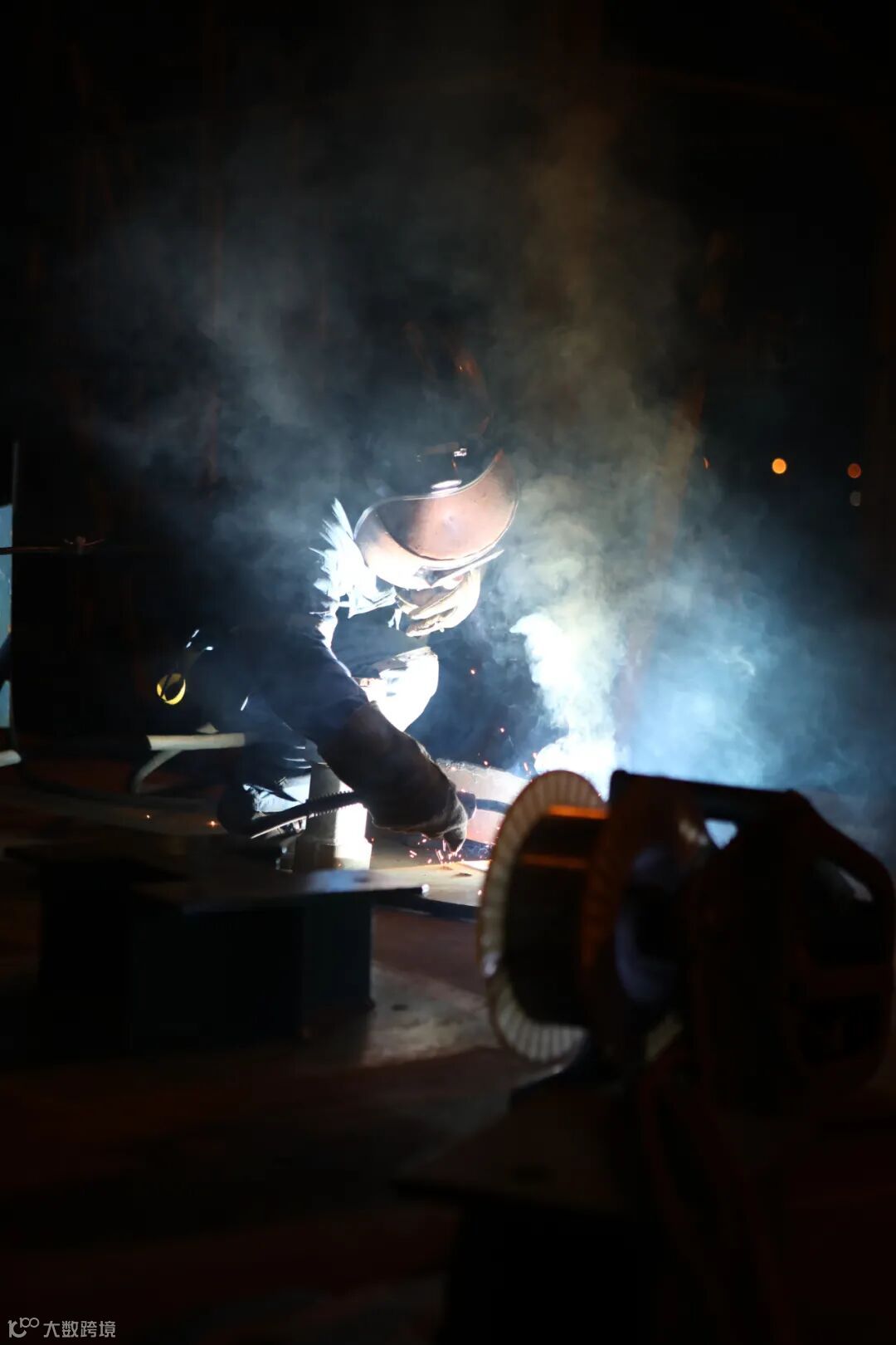 ▲20:30,在4000hp上,工人师傅正在20多米的高空焊接导缆器。
