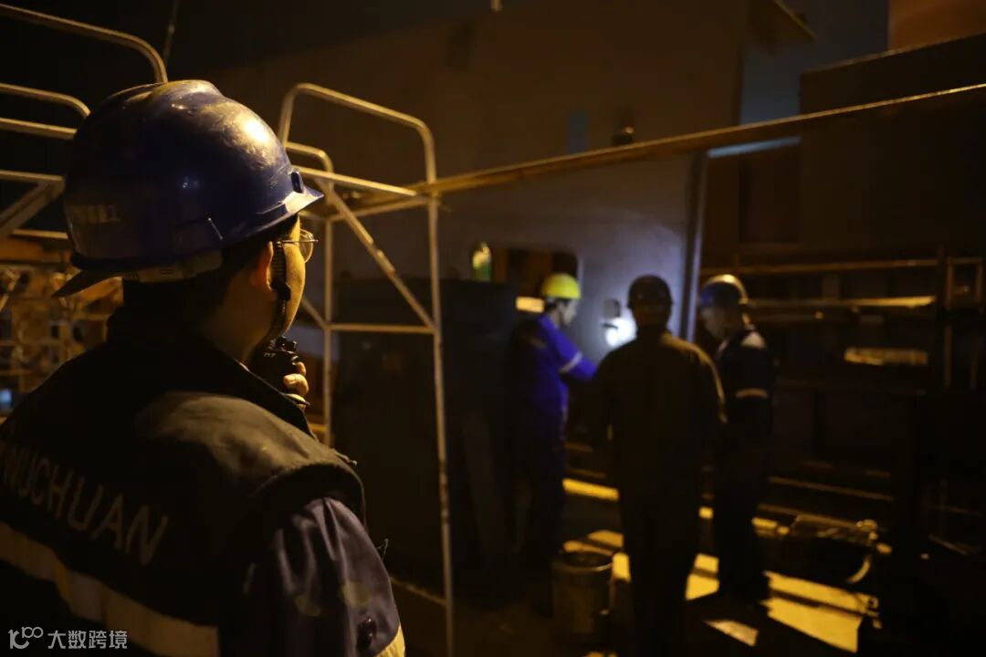 ▲21:03,在5000吨巡逻船上,舷侧减摇水舱刚刚吊装,工人师傅正在进行安装施工。