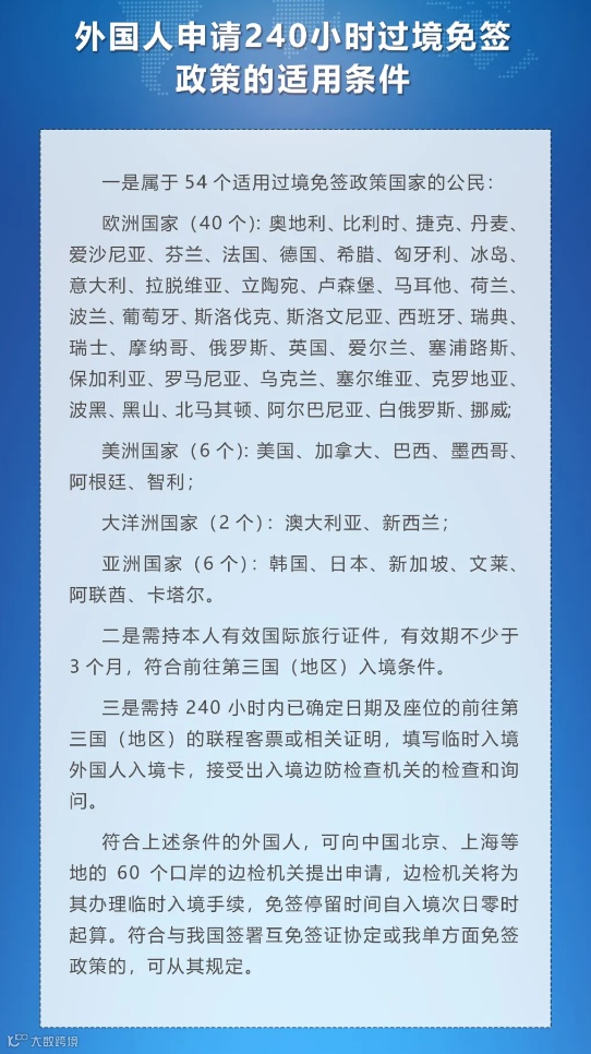 国家移民管理局今天发布公告,即日起全面放宽优化过境免签政策,将过境免签外国人在境内停留时间由原72小时和144小时均延长为240小时(10天),同时新增21个口岸为过境免签人员入出境口岸,并进一步扩大停留活动区域。符合条件的俄罗斯、巴西、英国、美国、加拿大等54国人员,从中国过境前往第三国(地区),可从24个省(区、市)60个对外开放口岸中任一口岸免签来华,并在规定区域停留活动不超过240小时。