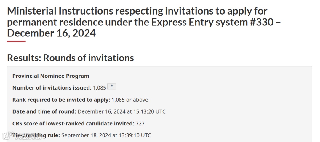 加拿大时间2024年12月16日,联邦快速通道Express Entry第330次邀请,本次对省提名项目候选人进行邀请。分数线727,邀请1085人。刚好727分的申请人,需要在2024年9月18日前入池。