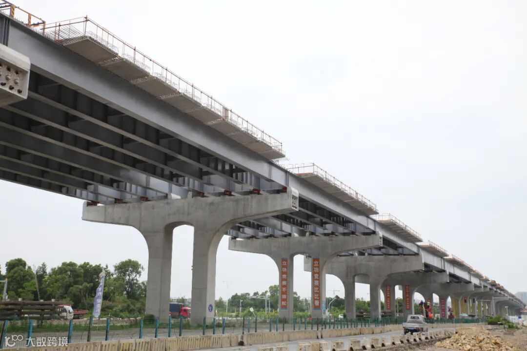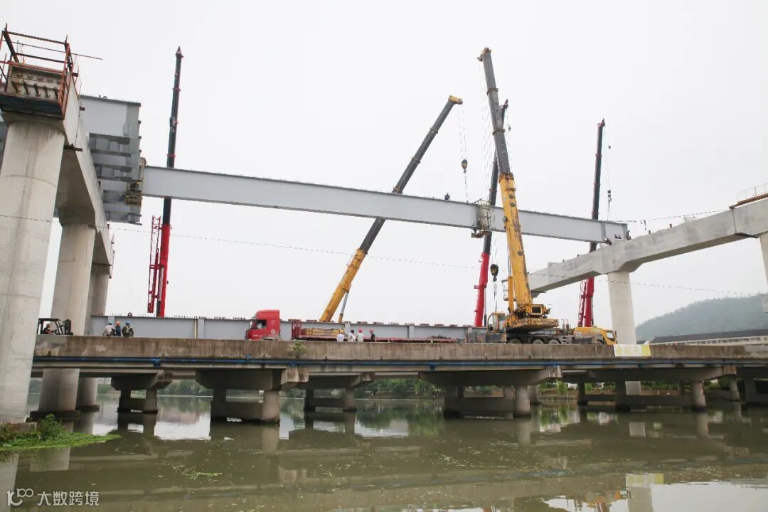 6月7日,浙江台州路泽太高架温岭段跨越金清港(项目名称:路泽太高架TJ03标段第126联跨麻车桥60米跨钢梁)的“桥上架桥”钢板桥梁安装过半,在不久前的5月30日,该施工区域顺利完成了第一根60米钢梁的试吊安装。