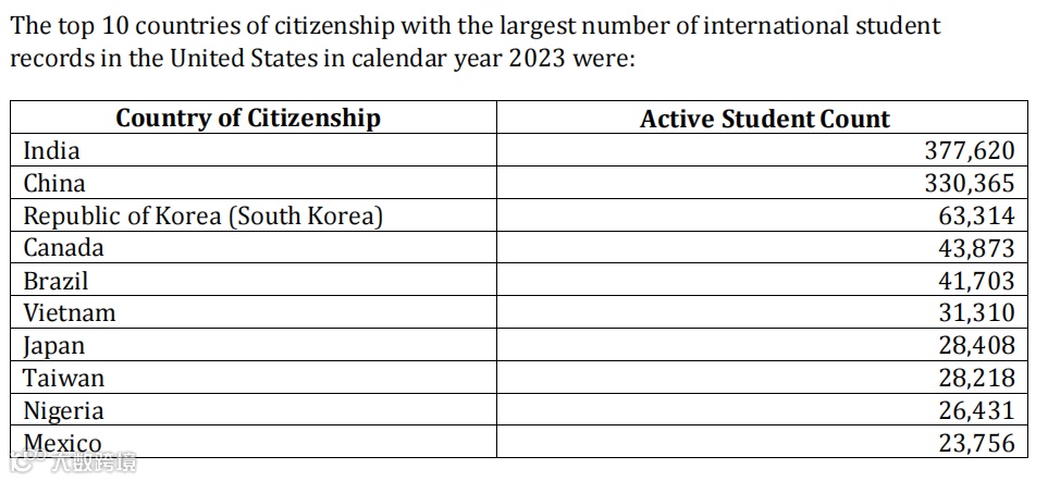 根据美国移民局数据,2023年美国在读的国际留学生有1,503,649人,在这其中印度位列第一占25.11%,中国留学生占22.0%,在读留学生方面两个国家人数相差不大。