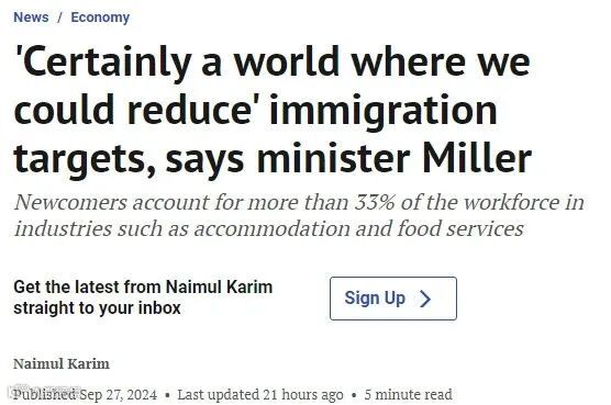 加拿大移民部长马克·米勒表示,他正在研究减少每年允许的永久居民人数,同时准备在11月公布年度移民指标。