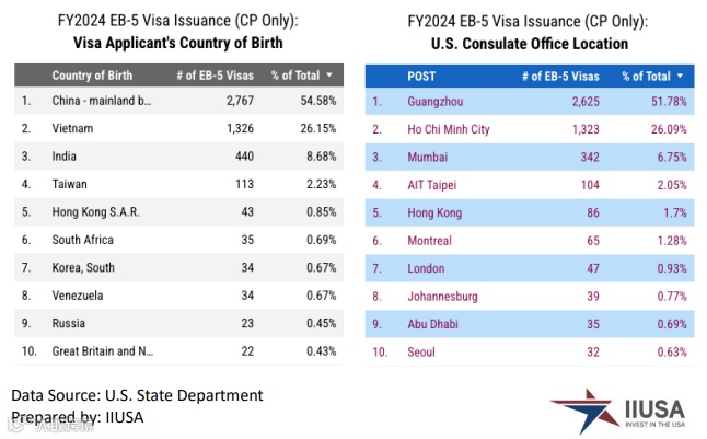 中国、越南、印度的投资人是2024财年上半年获得EB-5签证的前三位。特别是在2024财年上半年签发的EB-5签证中,近55%被中国申请者获得,其中超过2,600份EB-5签证是在广领馆处理的。