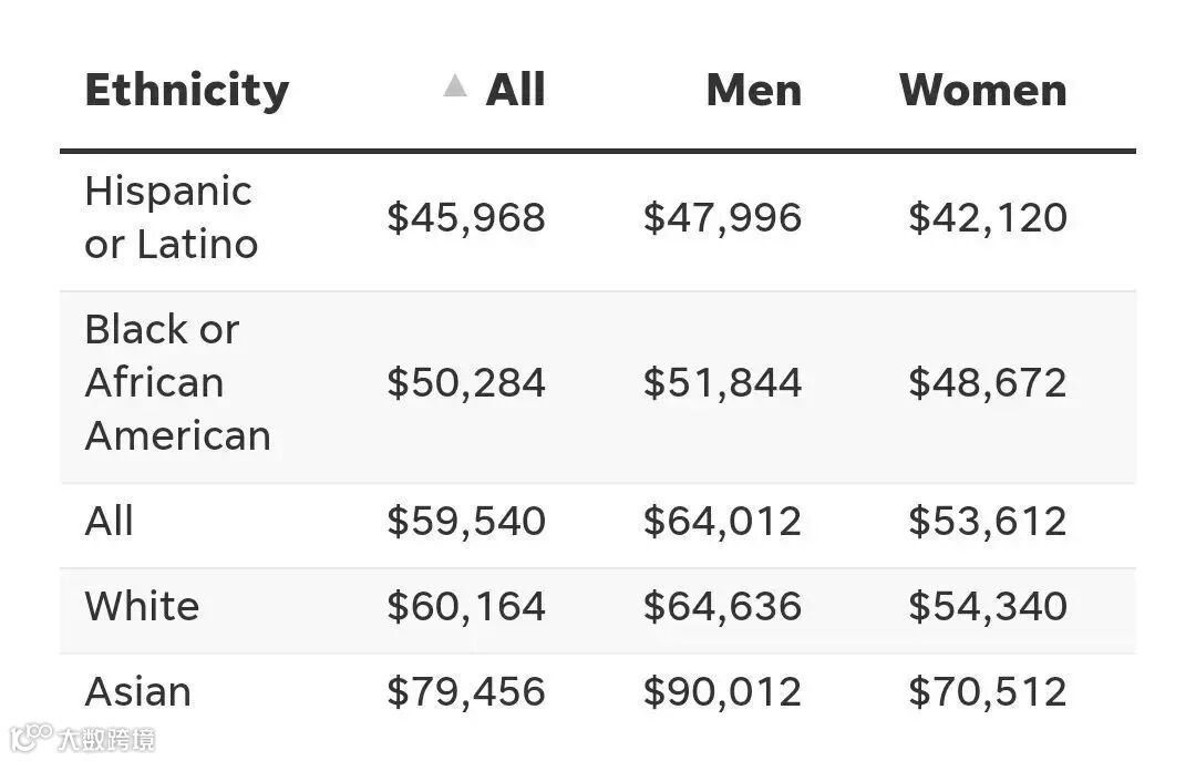 亚洲人群的年收入高居榜首,达到79,456美元,其中亚洲男性的平均年薪为90,012美元,亚洲女性为70,512美元,进一步凸显了种族与性别在薪资方面的交叉影响。