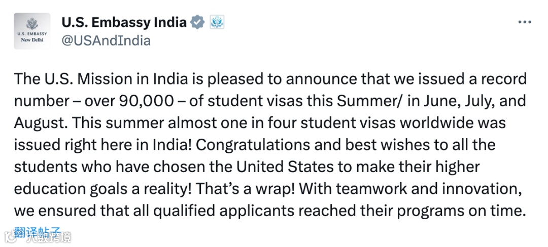 2023年暑期,美使馆批准的学生签证中,有超过1/4的学生来自印度。