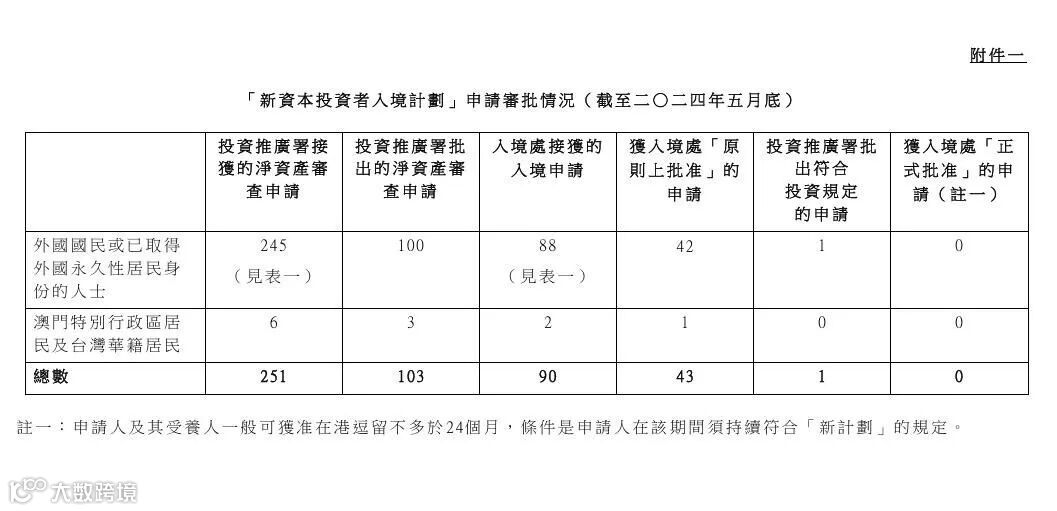 自「新计划」于三月一日起推出至五月底,投资推广署接获逾250宗申请,并已批出逾100宗申请的净资产审查,当中包括欧美和新加坡等地。入境处则已就逾40宗申请作出原则上批准,让申请人以访客身份在港作出所承诺的投资。如接获的申请全数获批,预计可为香港带来超过75亿港元的资金,增强香港资产及财富管理业的发展优势。