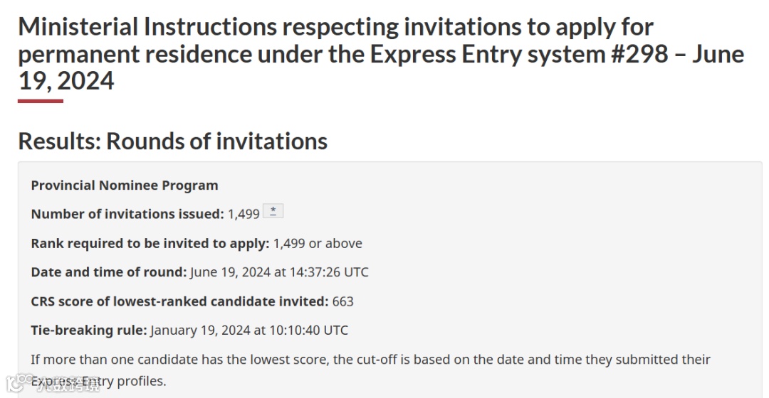 2024年6月19日,加拿大联邦快速通道向省提名(Provincial Nominee Program)候选人发出了1499份指定项目邀请,抽选分663分。
