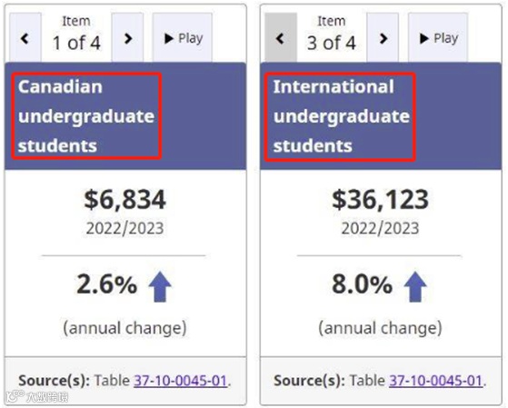 2022-2023年度,本科类本地学生平均支付6,834加元学费,比上一学年增长约2.6%,国际留学生则平均支付36,123加元学费,比上一学年增长约8.0%。