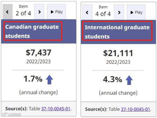 2022-2023年度,研究生类本地学生平均支付7,437加元学费,比上一学年增长约1.7%,国际留学生则平均支付21,111加元学费,比上一学年增长约4.3%。