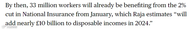 德意志银行英国首席经济学家Sanjay Raja预计,届时,英国的总体通胀率将略高于2%。对于2,000万英国人来说,这将意味着生活水平立即大幅提高。到那时,3,300万工人将已经从一月份起国民保险的削减中受益,Raja估计“这将使2024年的可支配收入增加近100亿英镑”。