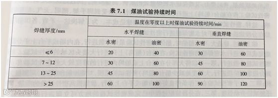 若试验时周围气温低于零度或焊缝为双面焊时,煤油作用时间应比表7.1所列规定增加一倍。