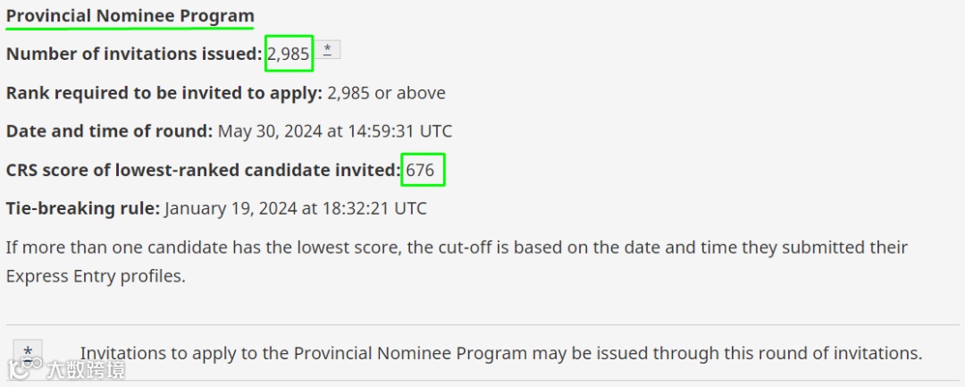 2024年5月30日,加拿大联邦快速通道向省提名PNP候选人发出了2,985份指定项目邀请,抽选分676分。