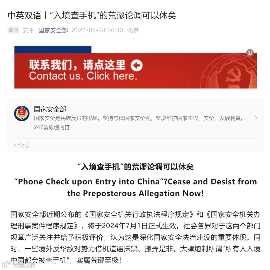 国家安全部在声明中明确表示,此举是针对间谍行为的,查验电子设备有严格的限定,并列出了三个“明确查验”的严格规范。