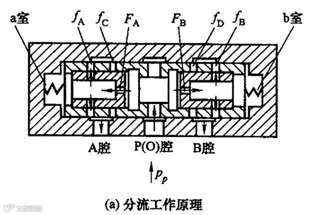 下图为该阀在分流工况时的状态。在P腔压力作用下,两个换向活塞处于两端,靠在阀芯上,此时可变节流口fA和fB起作用。在A、B压力相等时,阀芯在弹簧作用下对中。当出口压力不相等时,如A口压力大于B,a室压力上升,阀芯右移,左侧节流口fA增大,右侧节流口fB减小,使fB的压降增大,b室压力增加。直到a、b两室的压力相等,即使两个固定节流口FA和FB两侧压差相等,保证流出A、B两腔的流量相等。