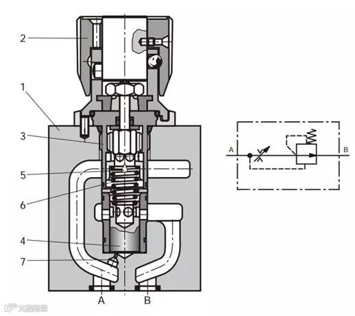下图为力士乐2FRM型调速阀。与上述原理相似,也是将节流阀的进出油口作用在减压阀芯两侧,实现节流阀两端压力稳定。不同的是油液先通过节流阀,再通过减压阀。