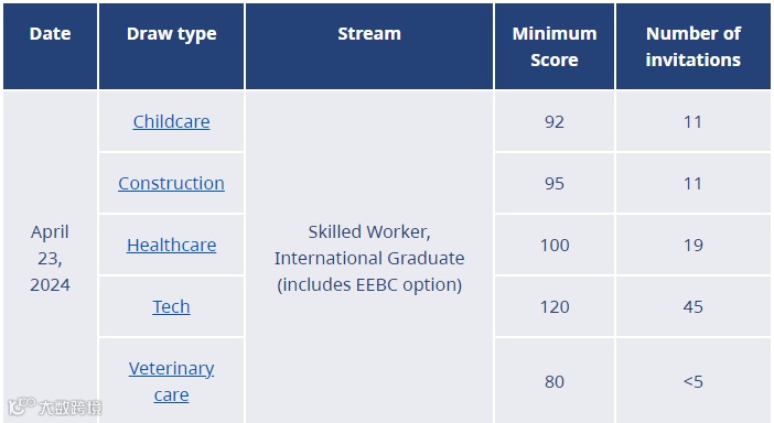 加拿大时间2024年4月23日,BC省省提名进行了定向邀请,早教类维持在92分,医护类从97分上涨至100分,建筑类从97分回落至95分,科技类从116分上涨至120分。