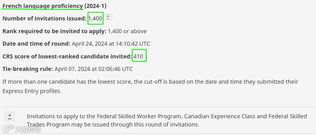2024年4月24日,加拿大联邦EE快速通道移民定向邀请法语候选人,抽选分410分,共1,400人获邀。