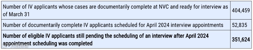 根据NVC更新的报告显示,截止2024年3月31日,美国移民签证积压数量已达到了351,624份,与今年2月份相比,增加了25,209份,增幅超过8%。