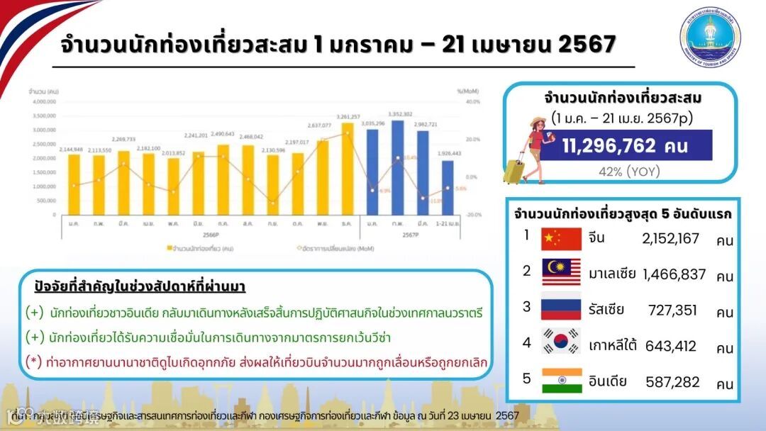 4月23日,泰国旅游与体育部公布了1月1日至4月21日外国游客抵达泰国的数据,总计超过1,100万人次。