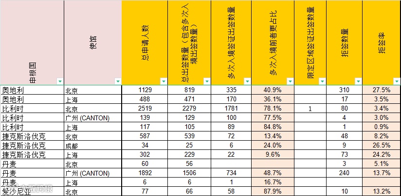 拉脱维亚紧随其后,占90.5%,但收到的签证申请量更高。其他申请批准率较高的国家有斯洛伐克、芬兰和卢森堡。