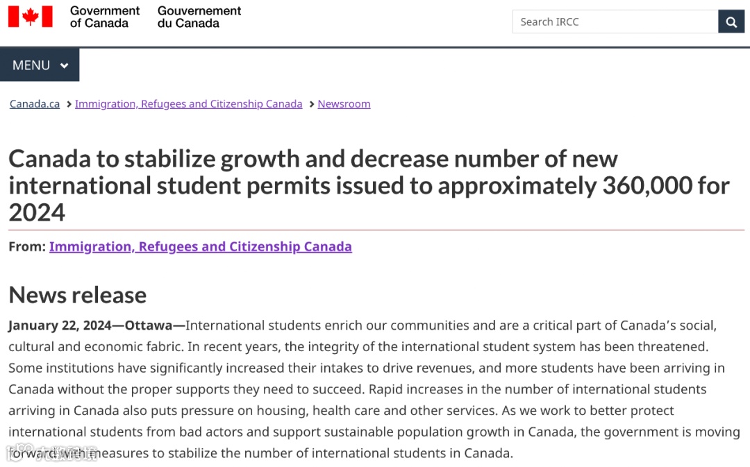 1月22日,加拿大联邦移民部长Marc Miller宣布将立即开始限制进入加拿大的国际学生的数量,给学生签证(Study Permit)设置上限,下一学年将减少35%的学签数量。